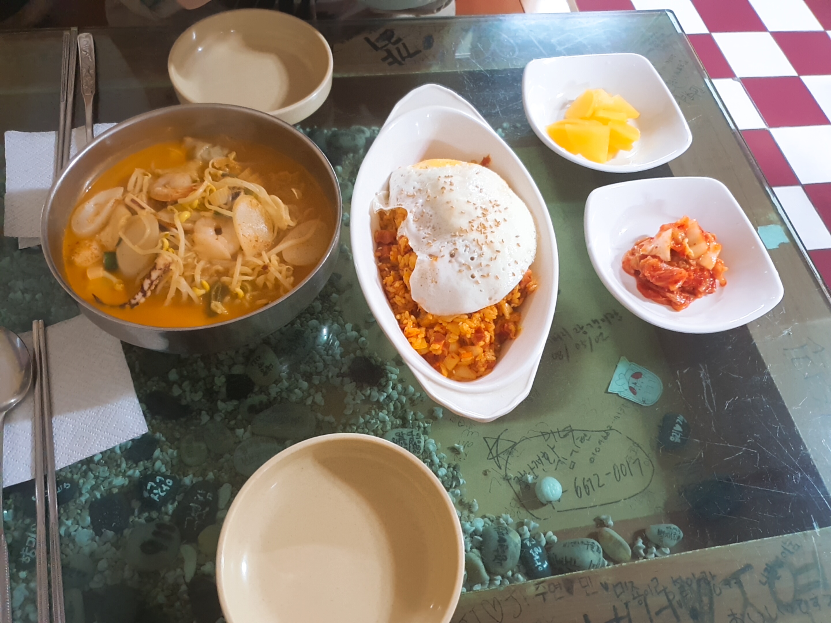 저희는 돈가스랑!! 햄 김치볶음밥!! 모둠 라면을 먹었느데요!!